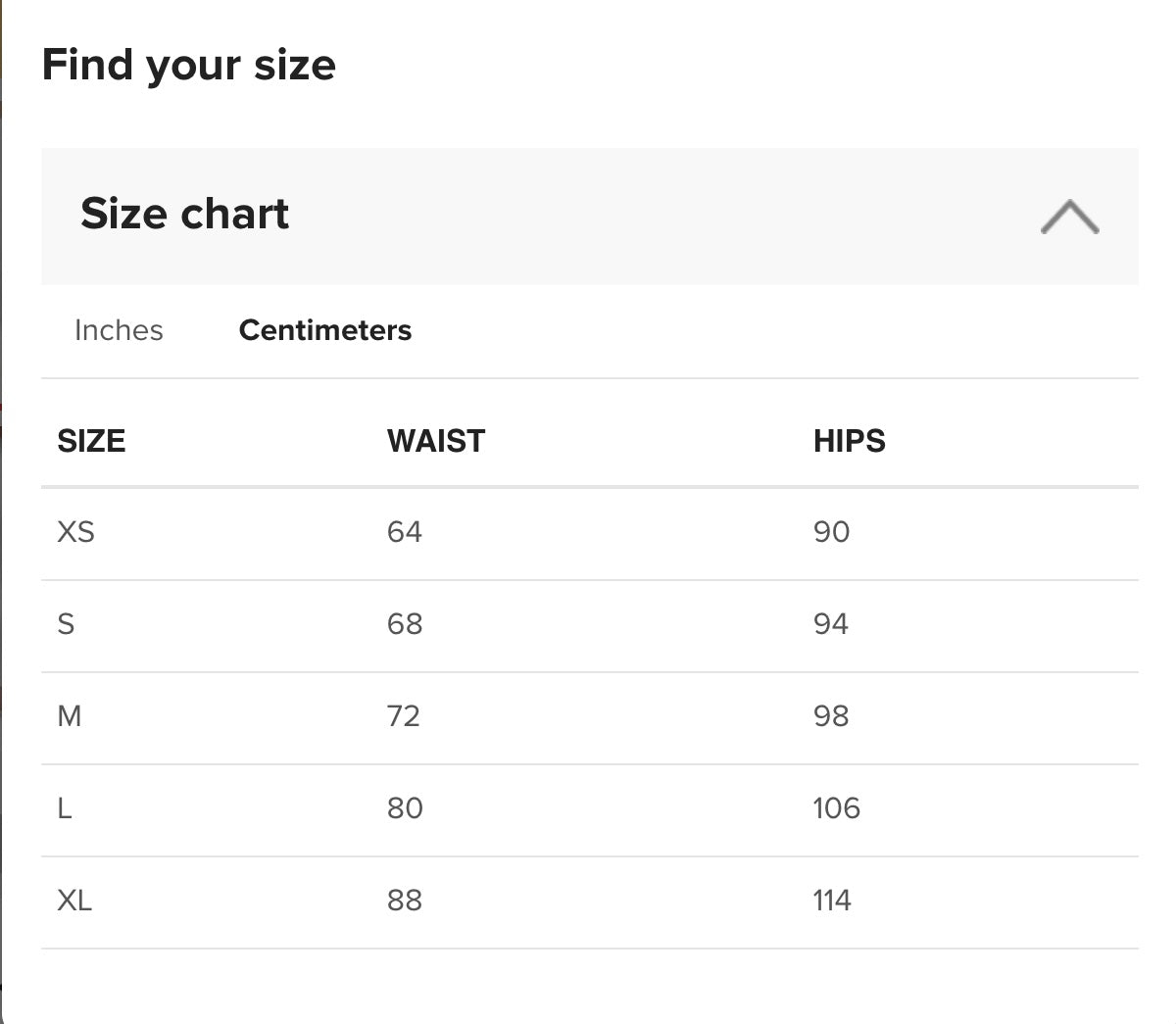 | Hips (cm) | 90 | 94 | 98 | 106 | 114 |