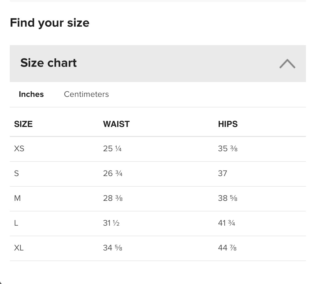 | Waist (inches) | 25 ¼ | 26 ¾ | 28 ⅜ | 31 ½ | 34 ⅝ |